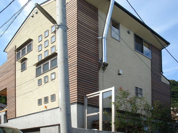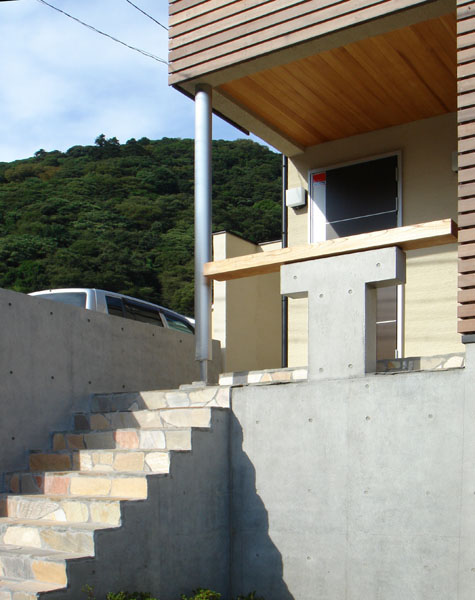 ・海にほど近い傾斜地に建てられた、地下1階、地上2階建ての住宅。 地階をRC造(鉄筋コンクリート造)、1・2階を木造としている。