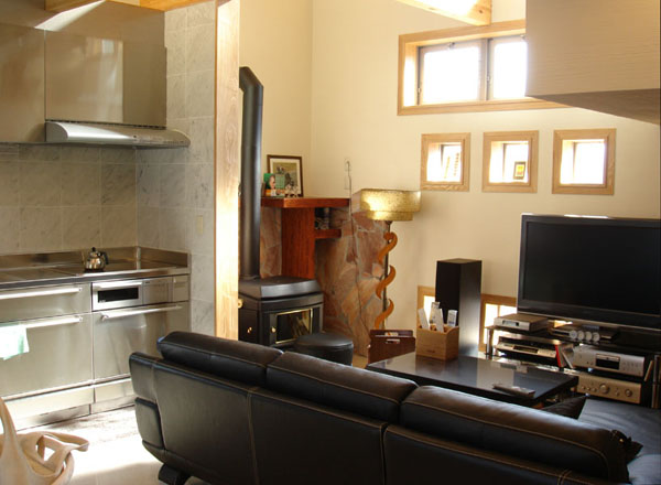 1階は主な生活スペースとなり、 各部屋は中庭に対して開いている。中庭以外の面には採光や換気のための機能的な開口部をもうけている。 リビングに設置された薪ストーブは、実際の機能だけでなく、見た目にも温かみのある空間を作り出して おり、この住宅に欠かせない、重要なアクセントとなっている。