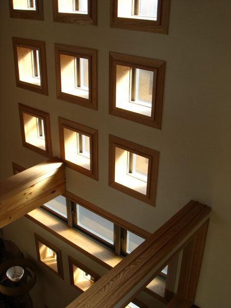 2階には書斎と客間が用意され、吹抜けを通じて1階とつながっている。吹抜けの中を縦に伸びる薪ストーブの煙突が、上下階のつながりを強調し、開放的な空間をつくり出している。